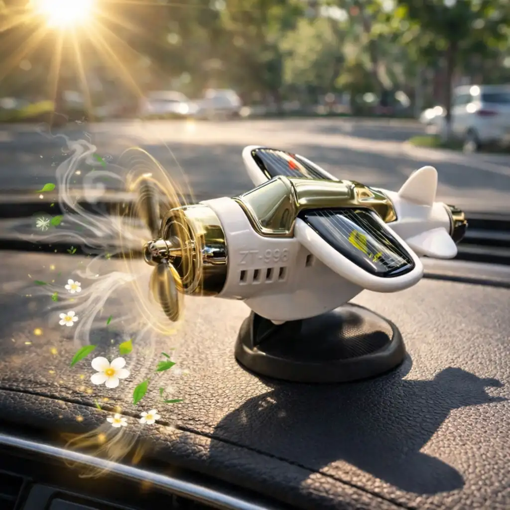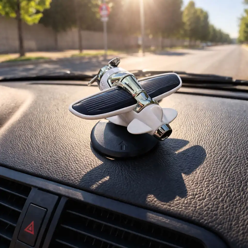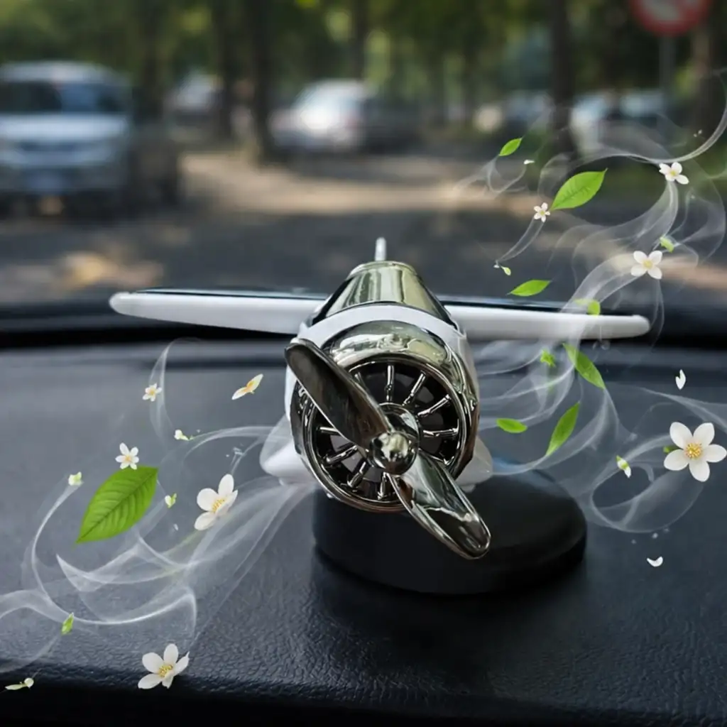 Güneş enerjisi ile çalışan pervaneli mini beyaz uçak, hem dekoratif hem fonksiyonel bir araç aksesuarıdır. Torpido üstüne yerleştirilerek kullanılır. Güneş ışığına maruz kaldığında pervane otomatik olarak dönmeye başlar ve içindeki özel koku ortama yayılır.