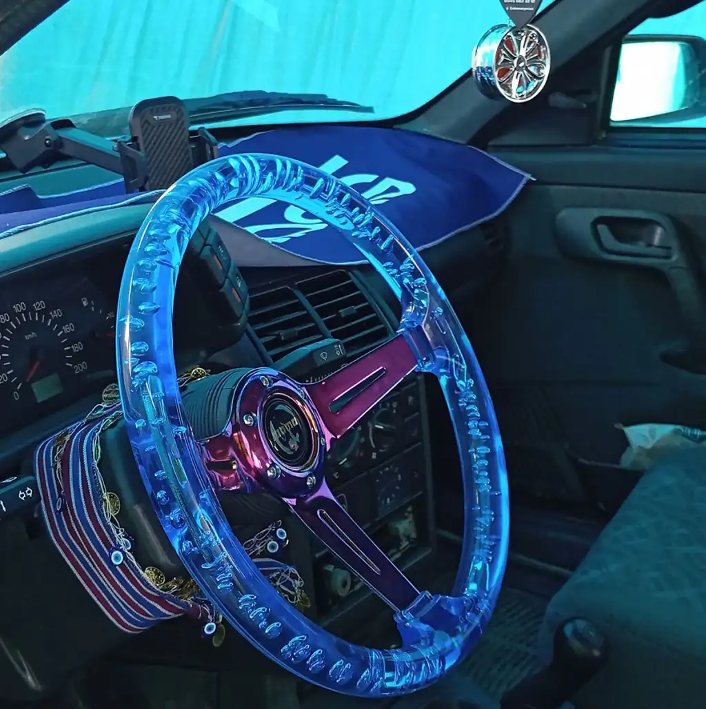 Ürün İçeriği 1 Adet Şeffaf Mavi Baloncuklu Direksiyon Ve bir adet Direksiyon Sabit Göbeği Olarak Gelmektedir.